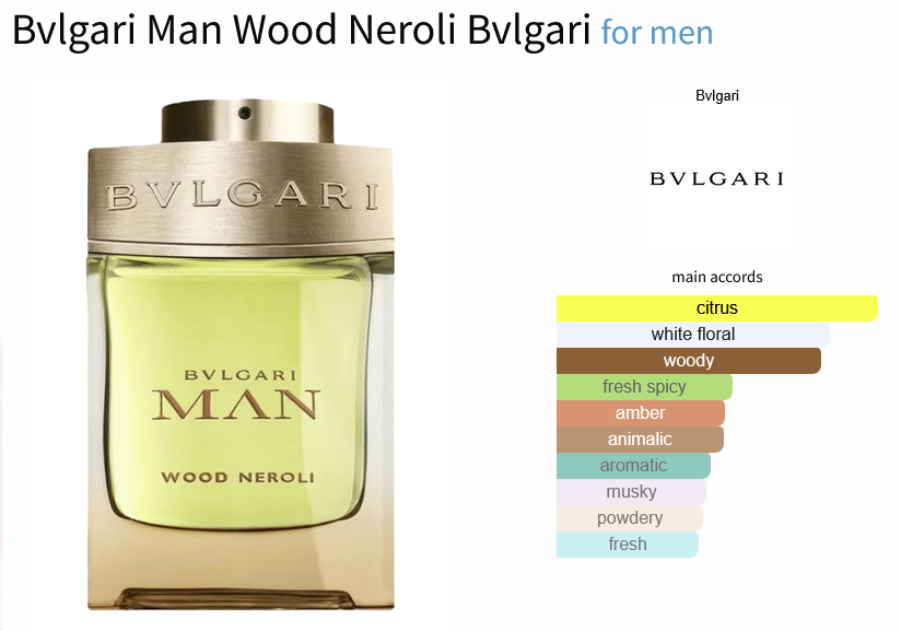 عطر مردانه بولگاری من وود نرولی از برند بولگاری، عطری با رایحه چوبی، گلی و مشک است. این عطر در سال ۲۰۱۹ به بازار عرضه شد. طراح این عطر آلبرتو موریلاس است. نتهای اولیه آن شامل بهار نارنج و ترنج؛ نتهای میانی آن شامل شکوفه پرتقال، سدر ویرجینیا و روغن سیپریول یا ناگارموتا؛ نتهای پایه آن شامل نتهای چوبی، مشک سفید، عنبر سائل، کهربا و چرم است.