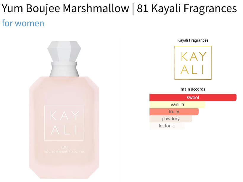 عطر زنانه یام بوجی مارشمالو | 81 از برند کایالی فرگرانس، عطری با رایحه گلی، میوهای و خوراکی است. این عطر جدید است. یام بوجی مارشمالو | 81 در سال 2024 به بازار عرضه شد. طراح این عطر گابریلا چلاریو است. نتهای اولیه آن شامل فریزیا، لیموی ایتالیایی، شکوفه شلیل و سیب است؛ نتهای میانی آن شامل مارشمالو، توت فرنگی، نارگیل و شکوفه پرتقال است؛ نتهای پایه آن شامل خامه زده شده، شکر، وانیل، مشک، تمشک و آمبروکسان است.