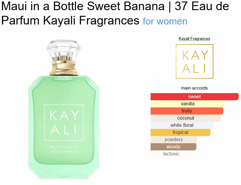 عطر Maui in a Bottle Sweet Banana | 37 Eau de Parfum از برند کایالی فرگرانس، عطری با رایحه گلی-میوه ای برای بانوان است. این عطر جدید است. عطر Maui in a Bottle Sweet Banana | 37 Eau de Parfum در سال 2024 به بازار عرضه شد. نتهای اولیه آن موز و گلابی؛ نتهای میانی آن نارگیل و یاس؛ و نتهای پایه آن وانیل و چوب صندل هستند.