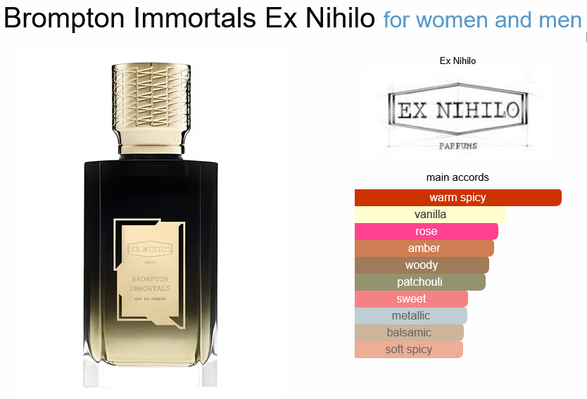 عطر Brompton Immortals از برند Ex Nihilo، عطری با رایحه شرقی گلی برای خانمها و آقایان است. Brompton Immortals در سال ۲۰۱۸ به بازار عرضه شد. طراح این عطر Jórdi Fernandez است. نتهای اولیه آن زعفران و فلفل صورتی؛ نتهای میانی آن گل رز بلغاری، یلانگ یلانگ، یاس سامباک و سوسن؛ نتهای پایه آن وانیل ماداگاسکار، کندر، نعناع هندی و مشک سفید هستند.