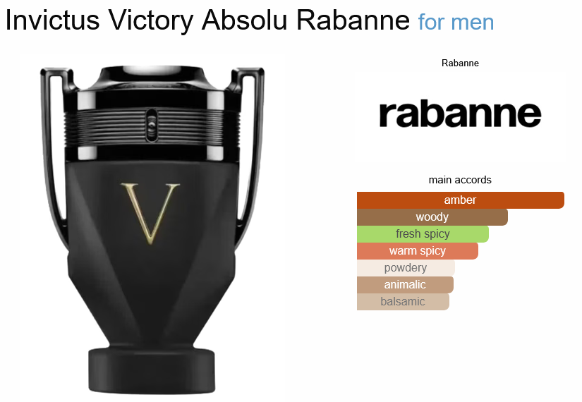 عطر Invictus Victory Absolu از برند Rabanne، عطری چوبی برای آقایان که در سال 2025 به بازار عرضه شد. Invictus Victory Absolu توسط Anne Flipo و Caroline Dumur خلق شده است. نت ابتدایی آن فلفل سیاه، نت میانی آن کهربا، عنبر سائل و نتهای چوبی و نت پایه آن چوب صندل، کندر و نعناع هندی است.