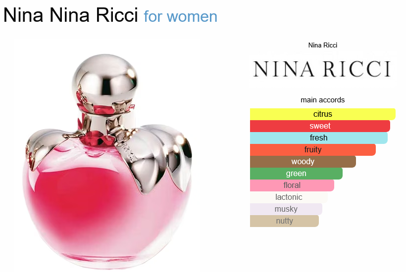 عطر زنانه نینا از برند نینا ریچی، عطری با رایحه گلی میوه ای است که در سال ۲۰۰۶ به بازار عرضه شد. این عطر توسط الیویه کرسپ، ژاک کاوالیه بلترود و کریستین دوسولیه خلق شده است. رایحه اولیه آن لیموی آمالفی و لیموترش است؛ رایحه میانی آن سیب گرنی اسمیت، پرالین، گل صد تومانی و داتوره است؛ رایحه پایه آن درخت سیب، مشک و سرو ویرجینیایی است.