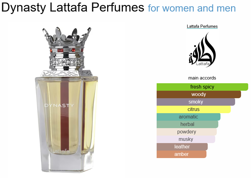 عطر Dynasty از برند Lattafa Perfumes، عطری با رایحه چوبی تند برای زنان و مردان است. این عطر جدید در سال 2025 به بازار عرضه شد. طراح این عطر Alex Lee است. نتهای اولیه آن شامل ترنج، زنجبیل، مریم گلی، تمشک و جوز هندی است؛ نتهای میانی آن شامل چای روئیبوس و جیر است؛ نتهای پایه آن شامل چوب سدر، کشمیر و چوب عنبر است.