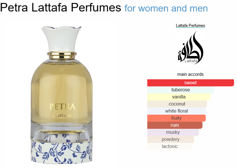 عطر پترا از برند لطافا پرفیومز، عطری با رایحه گلی، میوهای و خوراکی برای زنان و مردان است. این عطر جدید که در سال 2025 به بازار عرضه شد. نتهای اولیه آن رام و آلو؛ نتهای میانی آن گل مریم و نارگیل؛ و نتهای پایه آن وانیل، مشک و پرالین هستند.